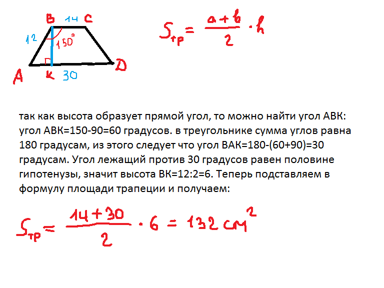 из угла В проводим высоту к основанию АD . угол B поделится на угол АВС = 60 и угол=90, =>угол а=30 градусам,а сторона лежащая напротив угла в 30 градусов в прямоугольном треуголбнике равна половине гипотенузы. высота лежит напротив угла 30 градусов=>высота=6. S=1/2*(A+B)h=1/2*(14+30)*6=132.