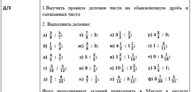 если коротко чтоб делить на обычную дробь множым на обратную(верх и низ меняем местами) чтоб делить мешаные числа превращаем в обычные дроби и делим как обычные дроби, При делении на целое переводим его в форму дроби с знаменателем дроби на которую делим если же дробь делим на число то тоже самое говорить