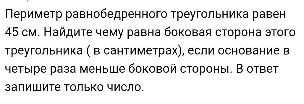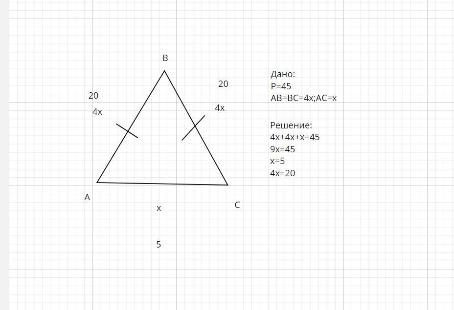 Дан равнобедренный треугольник с периметром 1 метр. Чему равны стороны этого треугольника, если основание на 5 см меньше боковой стороны? Ответ дайте в сантиметрах.