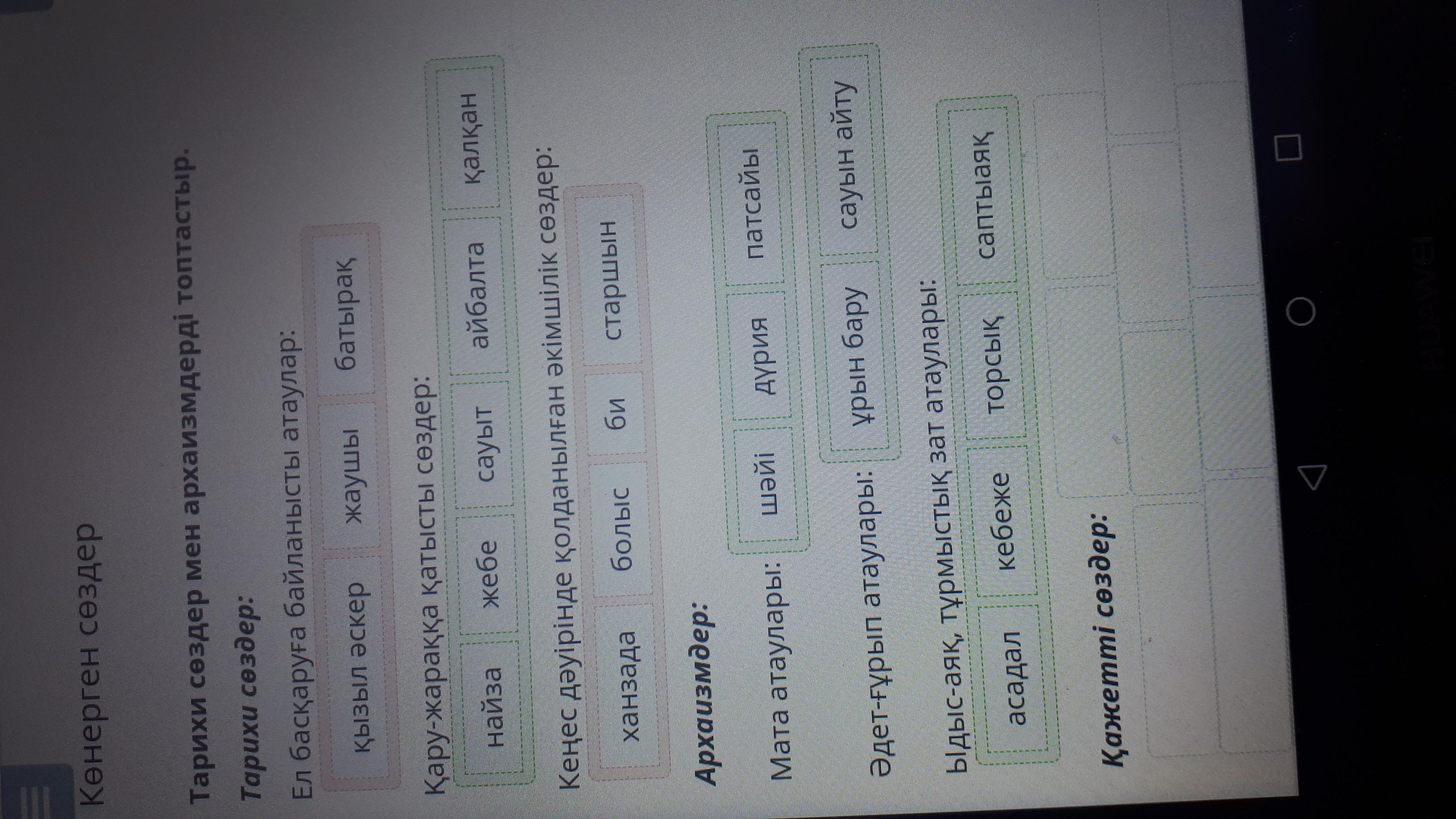 Көнерген сөздер Тарихи сөздер мен архаизмдерді топтастыр. Тарихи сөздер: Ел басқаруға байланысты атаулар: Қару-жараққа қатысты сөздер: Кеңес дәуірінде қолданылған әкімшілік сөздер: Архаизмдер: Мата атаулары: Әдет-ғұрып атаулары: Ыдыс-аяқ, тұрмыстық зат атаулары: Қажетті сөздер:
