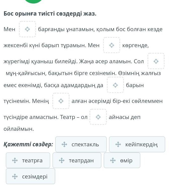 Ответ:1.Театрға2.спектакл3.кейіпкердің4.өмір5.театрдан6.сезімдері