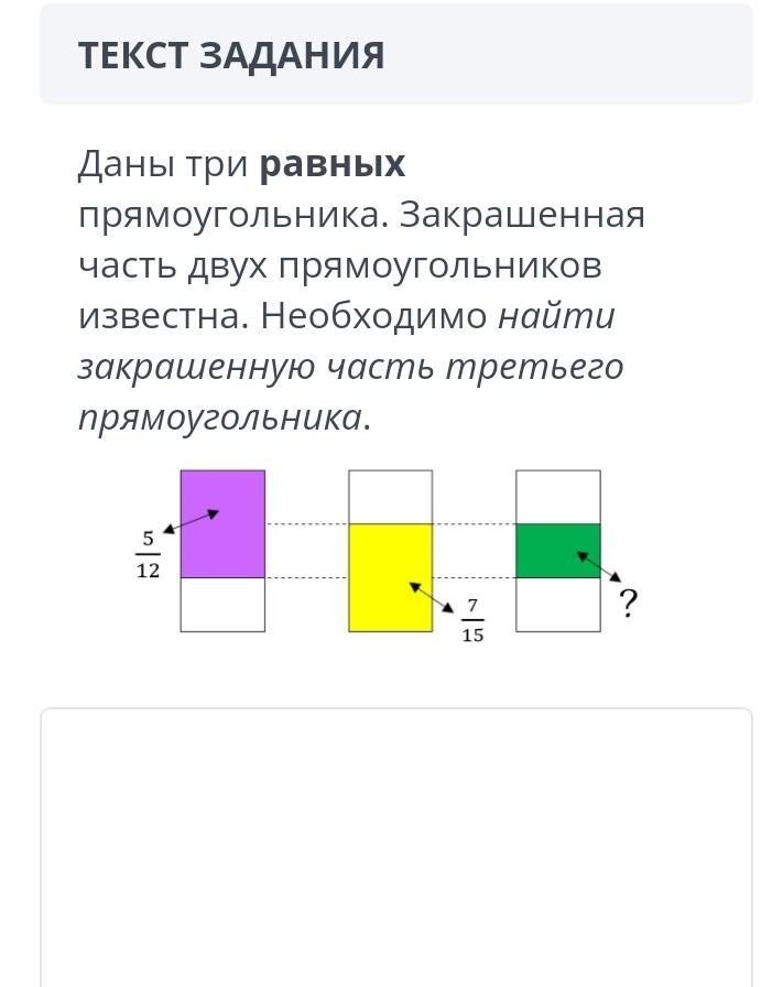 Даны три равных прямоугольника. Закрашенная часть двух прямоугольников известна. Необходима найти закрашенную часть третьего прямоугольника