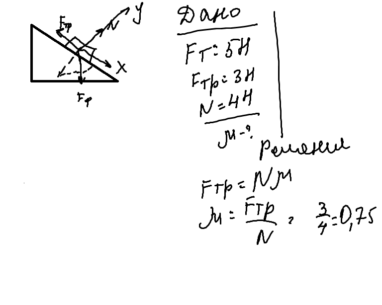 Тело равномерно движется по наклонной плоскости, на тело действует сила тяжести 5Н, сила трения 3Н и сила реакции опоры 4 Н. Каков коэффициент трения?