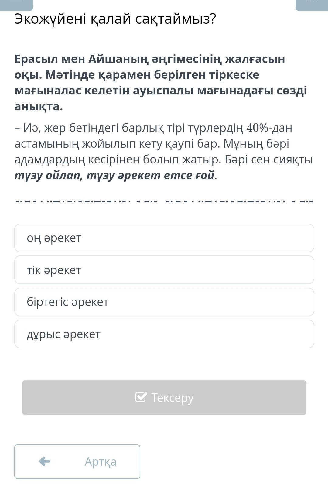 Ерасыл мен Айшаның әңгімесінің жалғасын оқы. Мәтінде қарамен берілген тіркеске мағыналас келетін ауыспалы мағынадағы сөзді анықта.