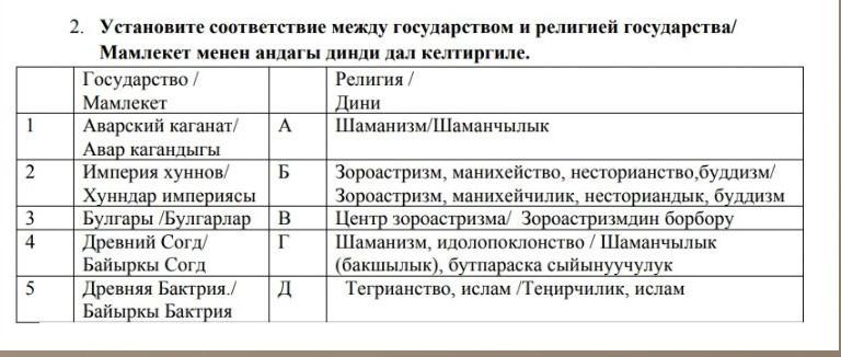 А) Шаманизм Б) Зороастризм, манихейство, несторианство,буддизм В) Центр зороастризма Г) Шаманизм, идолопоклонство Д) Тегрианство, ислам