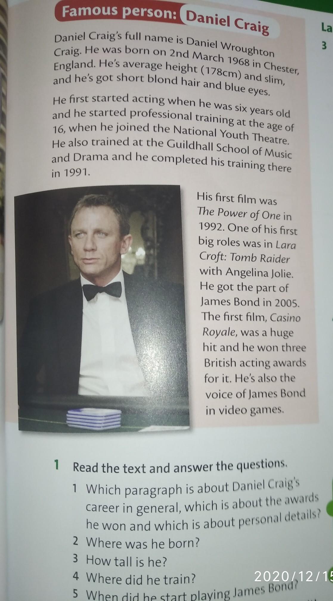 1. Second paragraph is about Daniel Craig's career. First paragraph is about personal details. Third paragraph is about the awards he won.