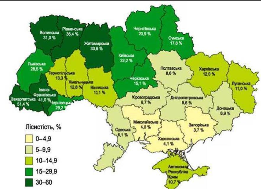 Как видно из карты, которая дана ниже в приложении, наибольший показатель лесистости у Закарпатской области (51,4 %).Затем следует Ивано-Франковская область.