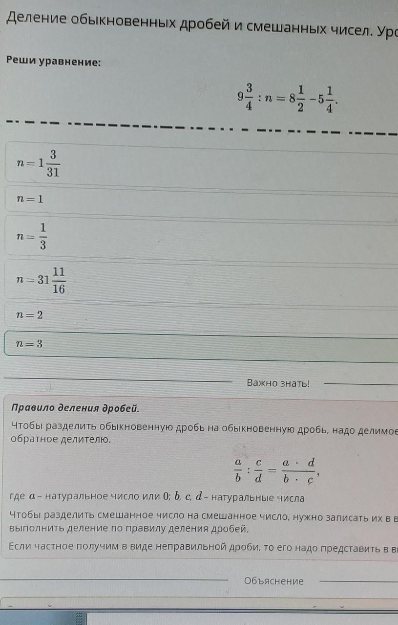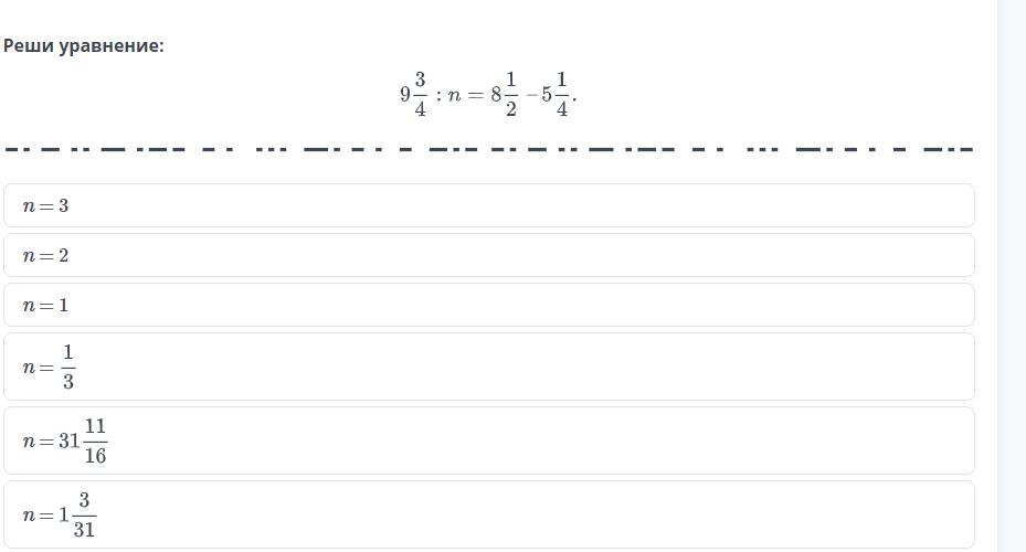 реши уравнение 9 3/4 : n = 8 1/2 - 5 1/4