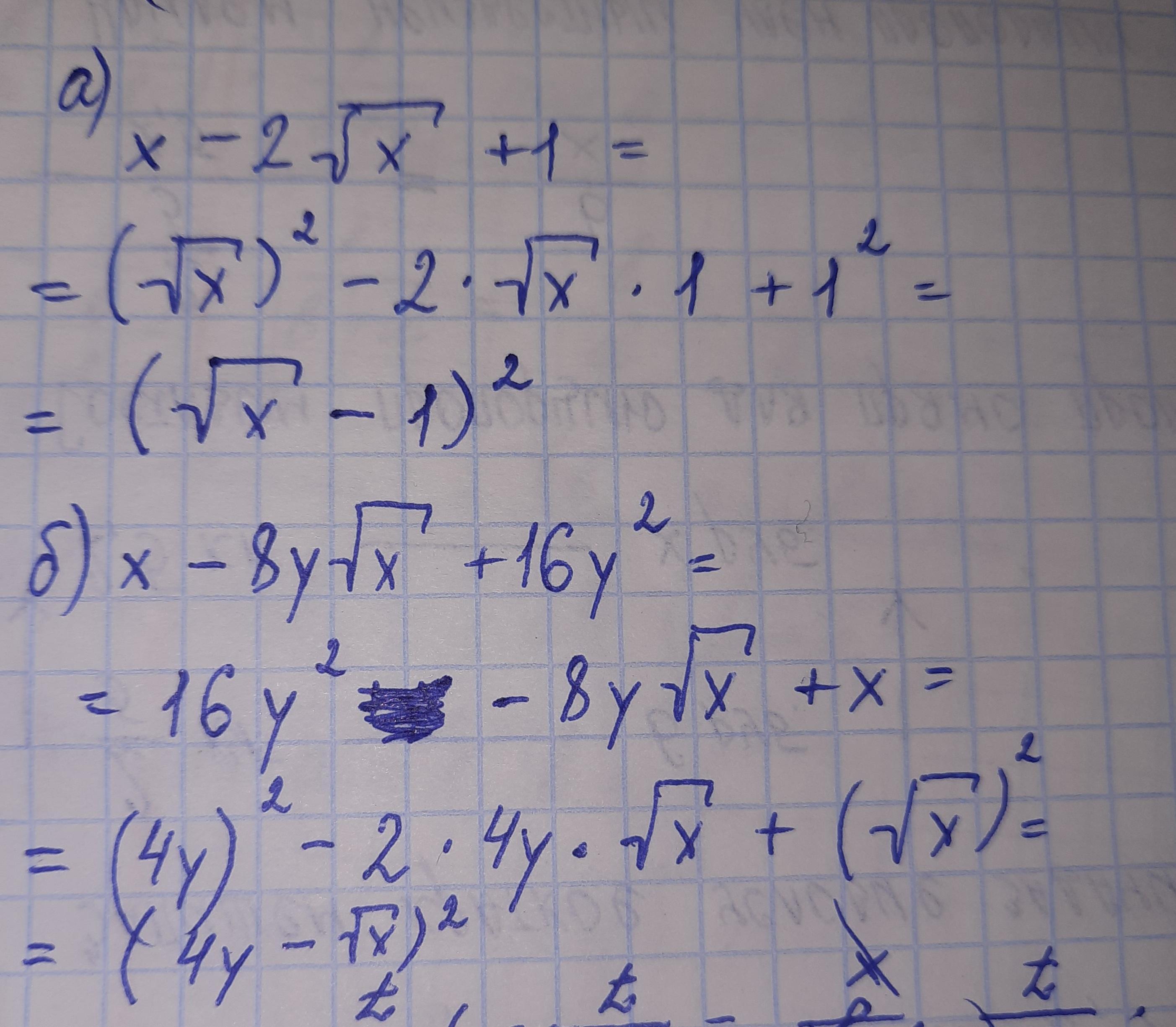 Ответ: а) (√х -1)² ; б) (4у-√х)²
