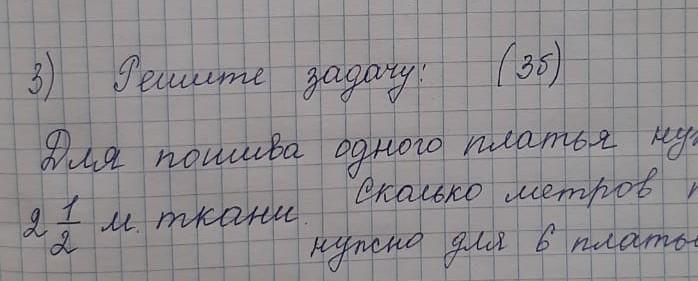 Для пошива 6 платьев нужно 2 1/2*6=5/2*6=5*6/2=15м ткани