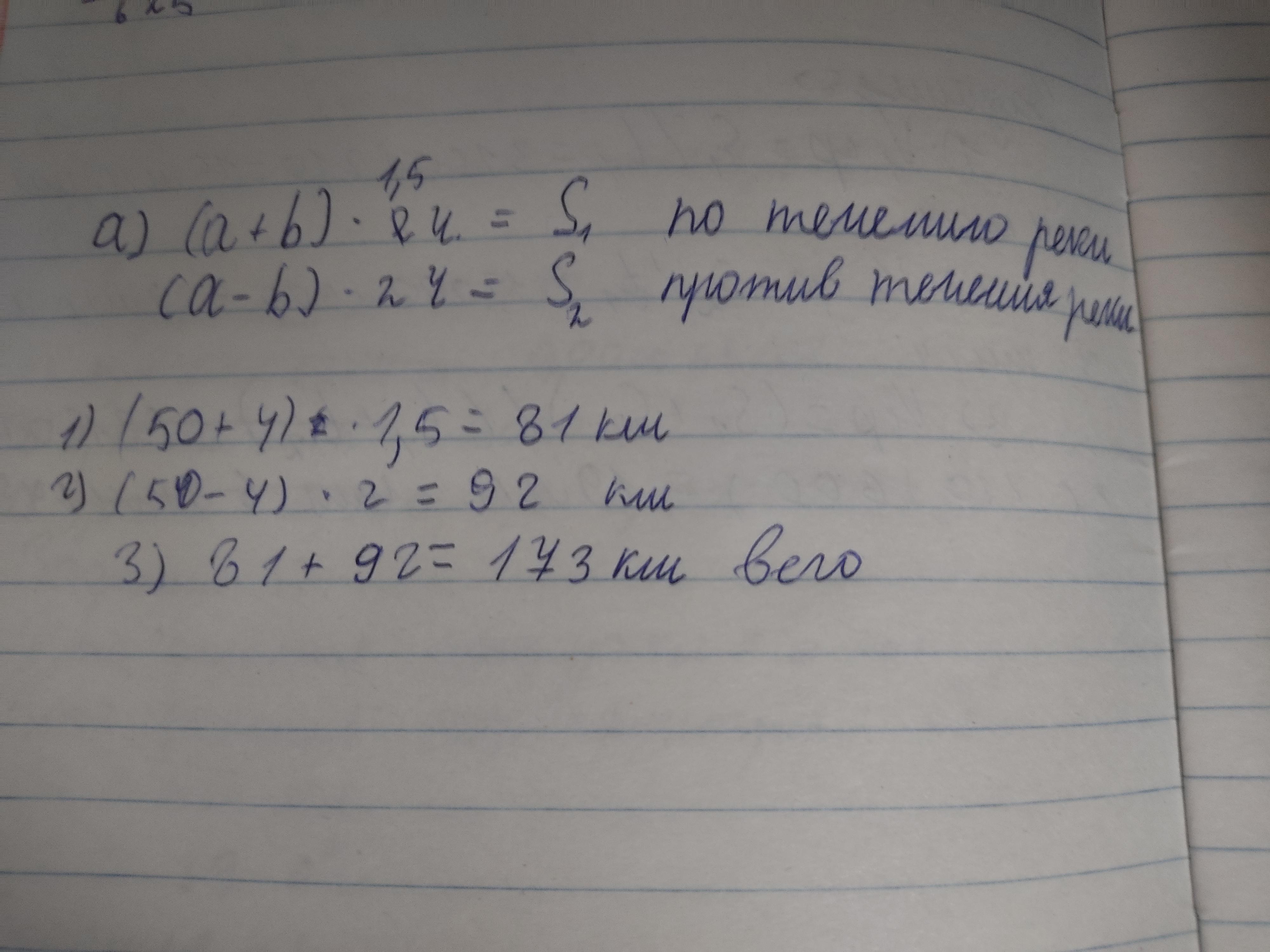 Расстояние между двумя пристанями теплоход проходит по течению реки за 1,5 ч, а против течения - за 2 ч. Собственная скорость теплохода а км/ч, а скорость течения реки b км/ч. Составьте выражение по условию задачи для нахождения: