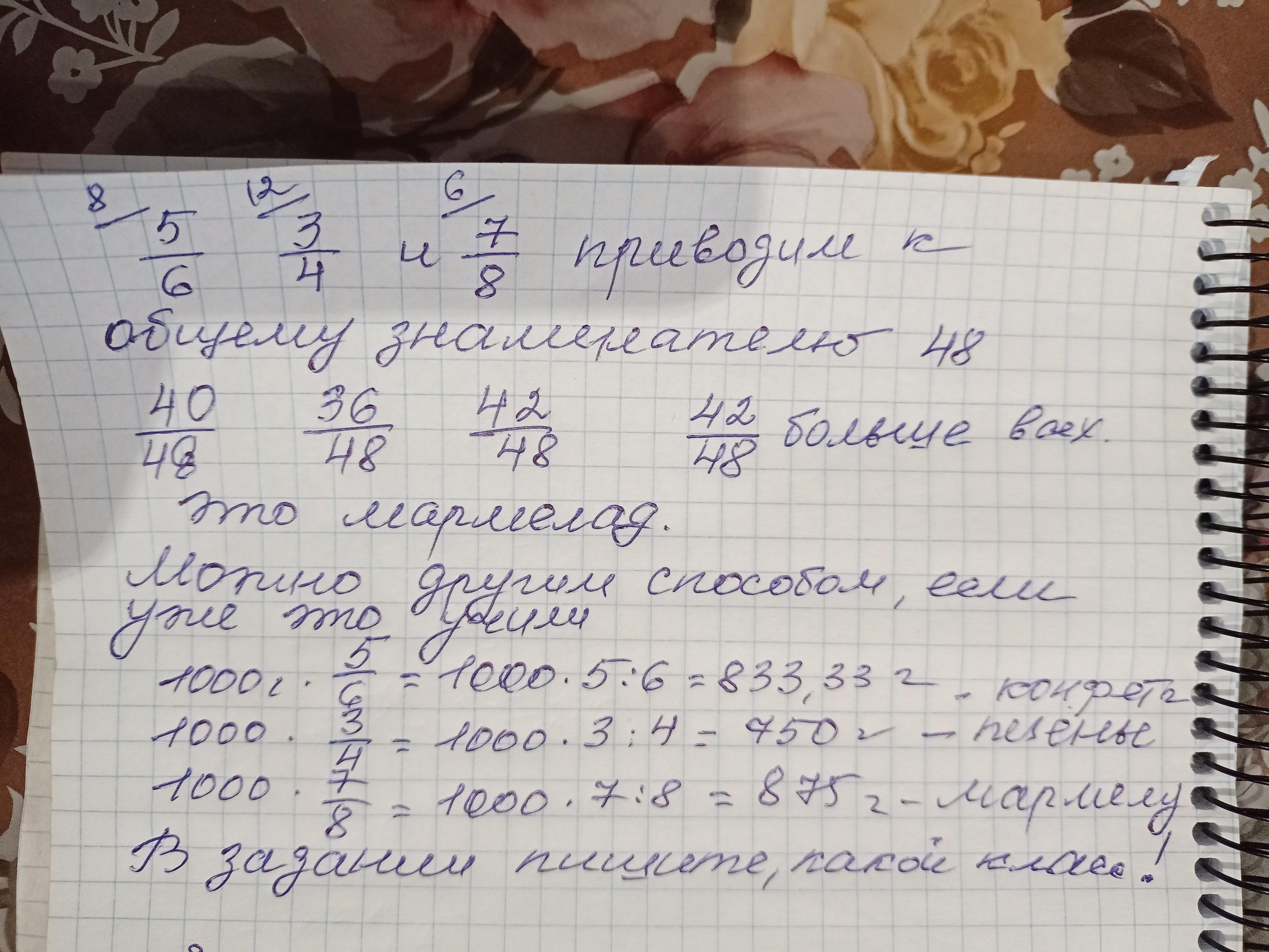 На день рождение Карлсон купил 5/6 – кг конфет,3/4 – кг печенья,7/8 — кг мармелада.