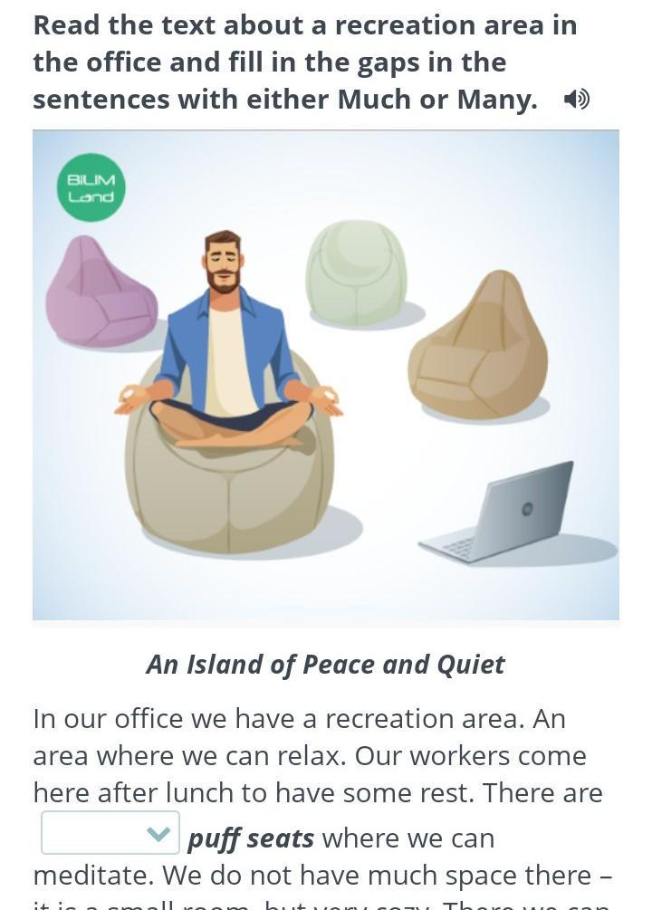 Read the office and fill in the gaps in the sentences with either Much or Many. BILIM Lond the text about a recreation area in An Island of Peace and Quiet In our office we have a recreation area. An area where we can relax. Our workers come here after lunch to have some rest. There are puff seats where we can meditate. We do not have much space there - it is a small room, but very cozy. There we can also have some drinks - tea or coffee. We do