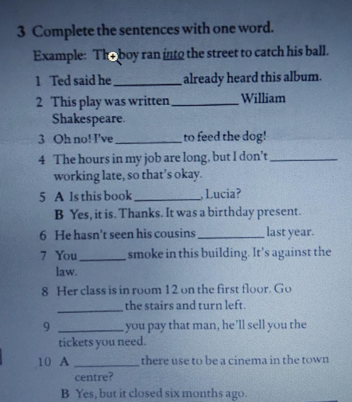 1. have 2. by 3. got 4. mind 5. yours (?) 6. for 7. can't 8. down 9. if 10. is