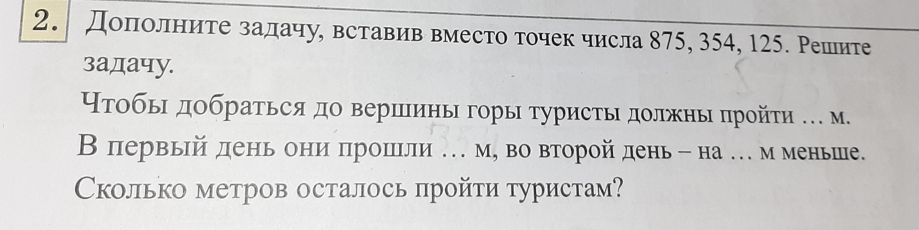 Чтобы добраться до вершины горы туристы должны пройти 875 метров. В первый день они прошли 354 метра, во второй день на 125 метров меньше. Сколько метров осталось пройти туристам?