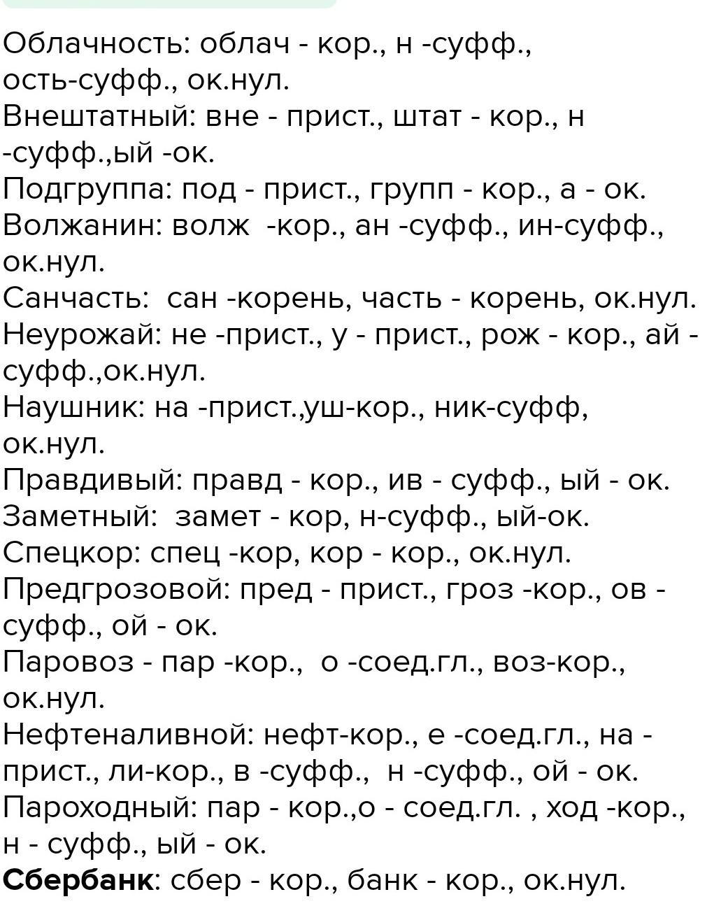 Облачность, подгруппа, санчасть, неурожай, наушники, правдивый, заметный, предгрозовой, паровоз, нефтеналивной, пароходный, сбербанк.
