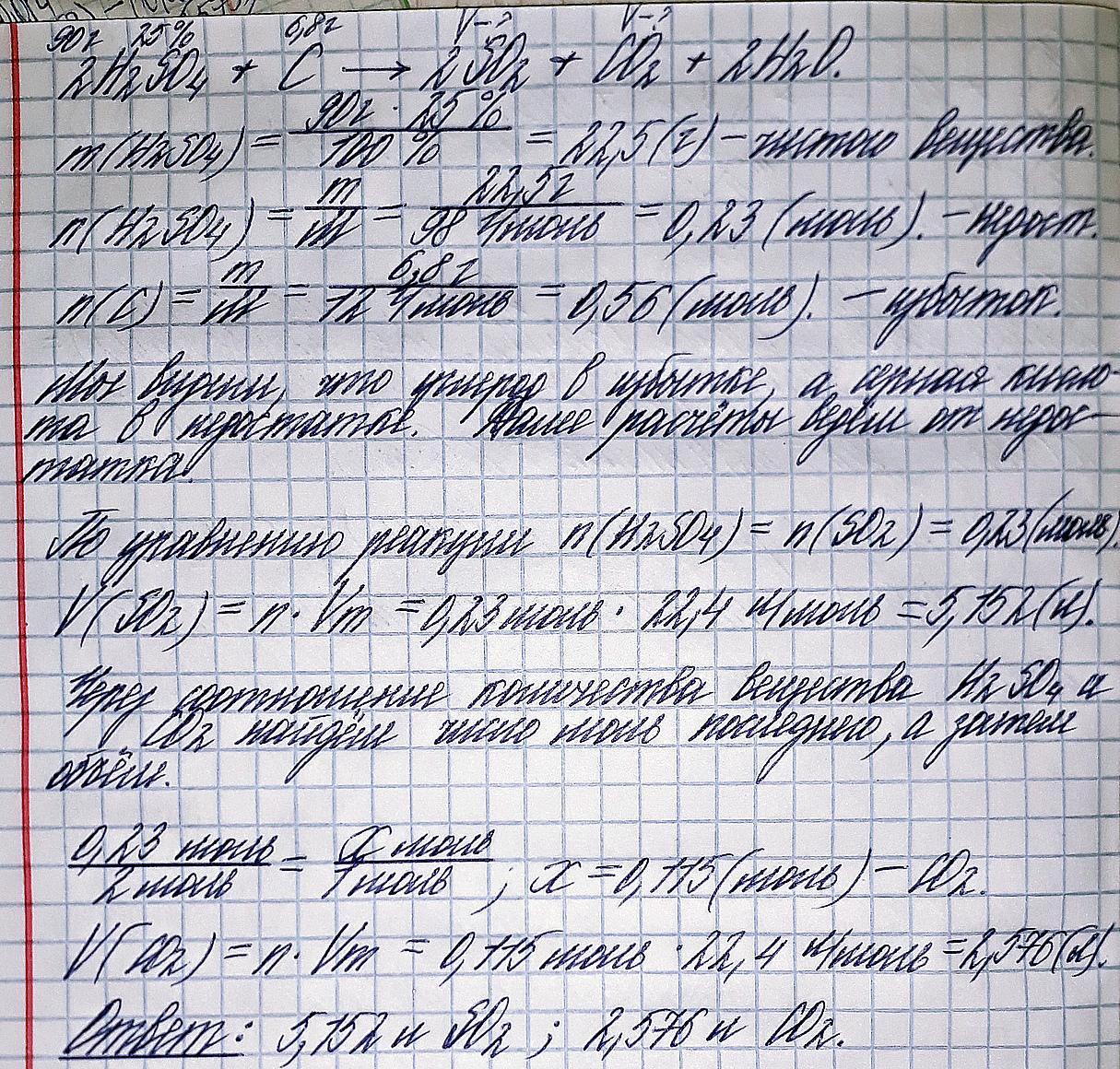 Оределите объемы (н.у) газов (2) образованных при взаимодействии 90 г 25% -м р-вм серной кислоты с 6,8г углерода.