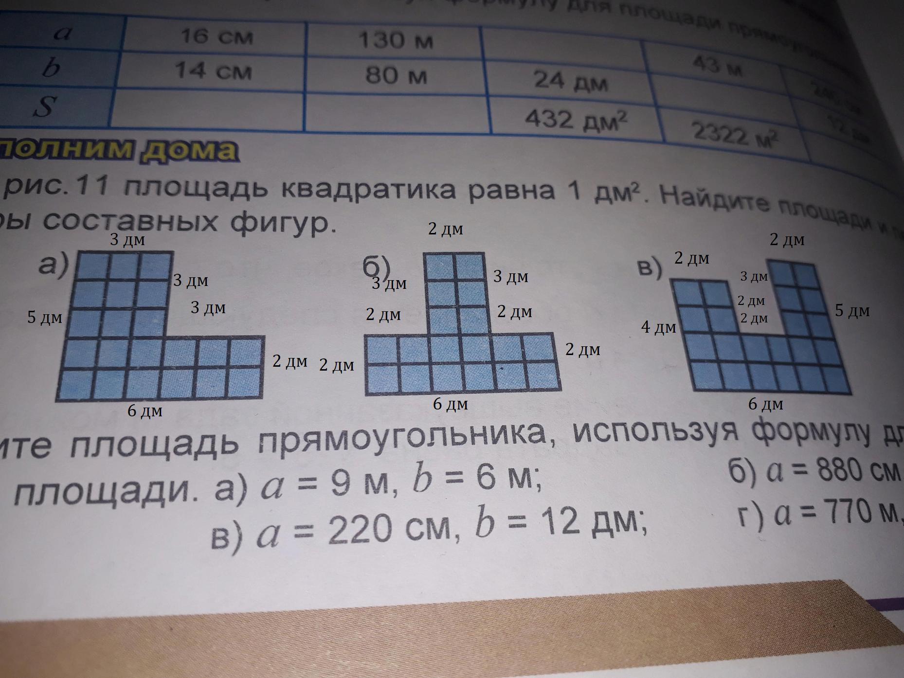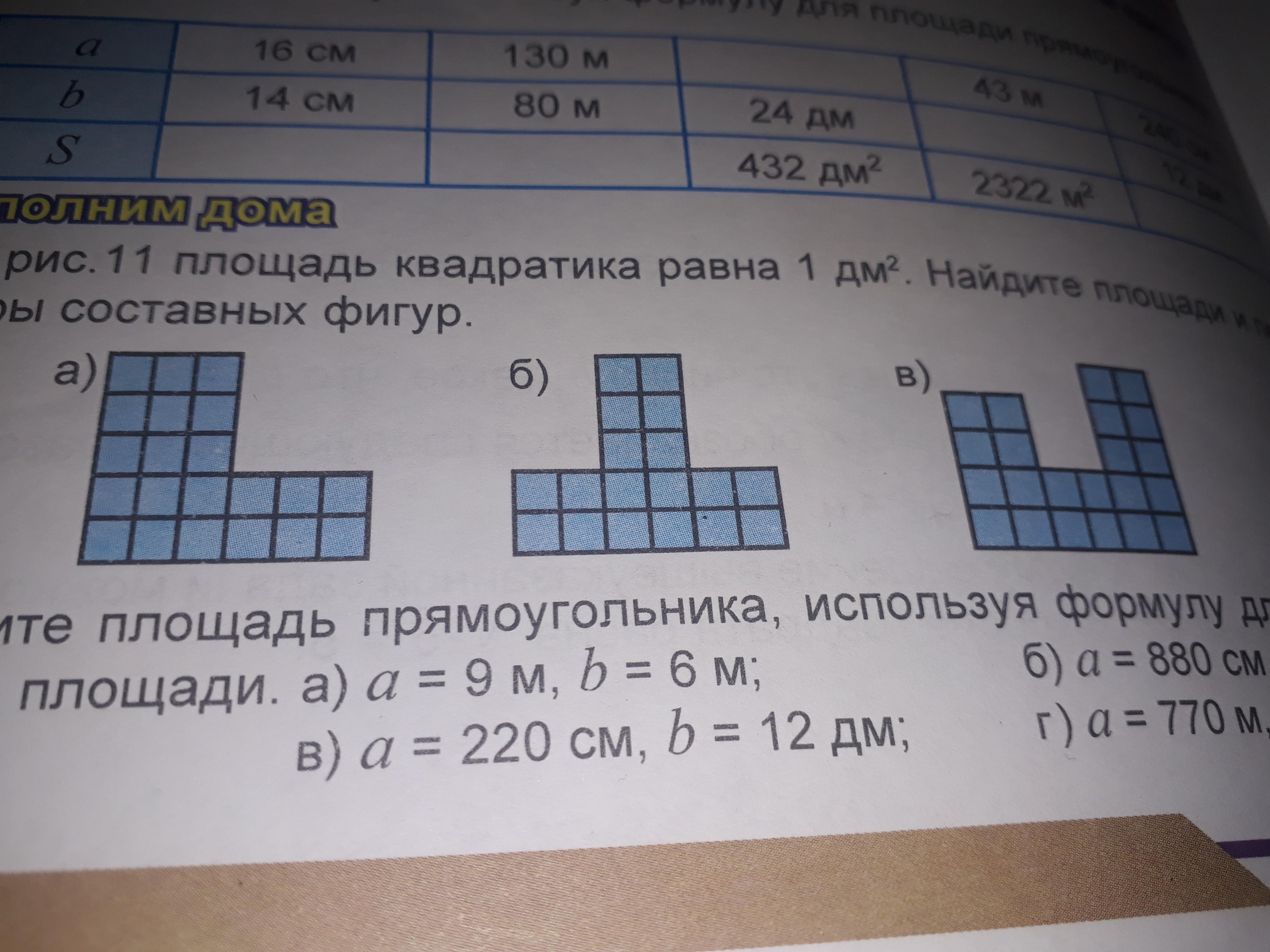 Так как площадь одного квадратика равна 1 дм², то площадь составной фигуры равна произведению площади квадратика, на количество таких квадратиков в данной составной фигуре.
