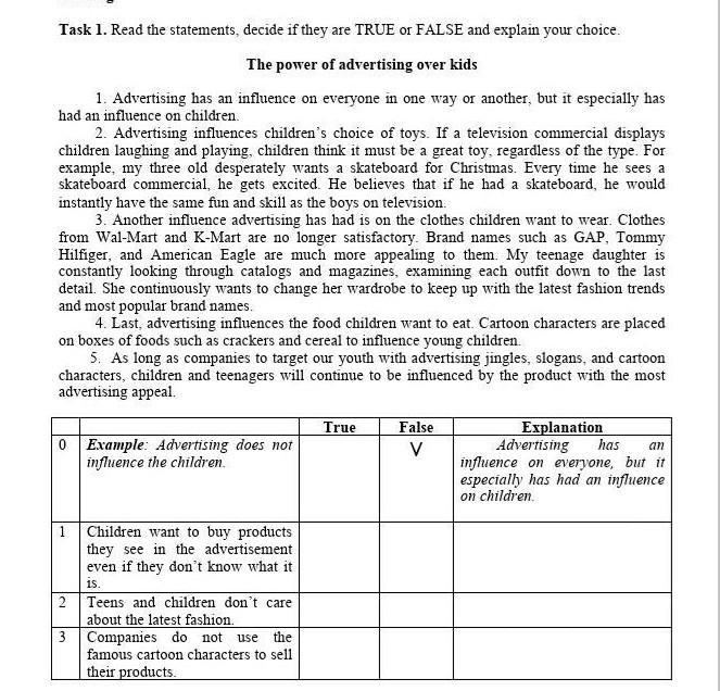 1. True (If a television commercial displays children laughing and playing,children think it must be a great toy,regardless of the type)