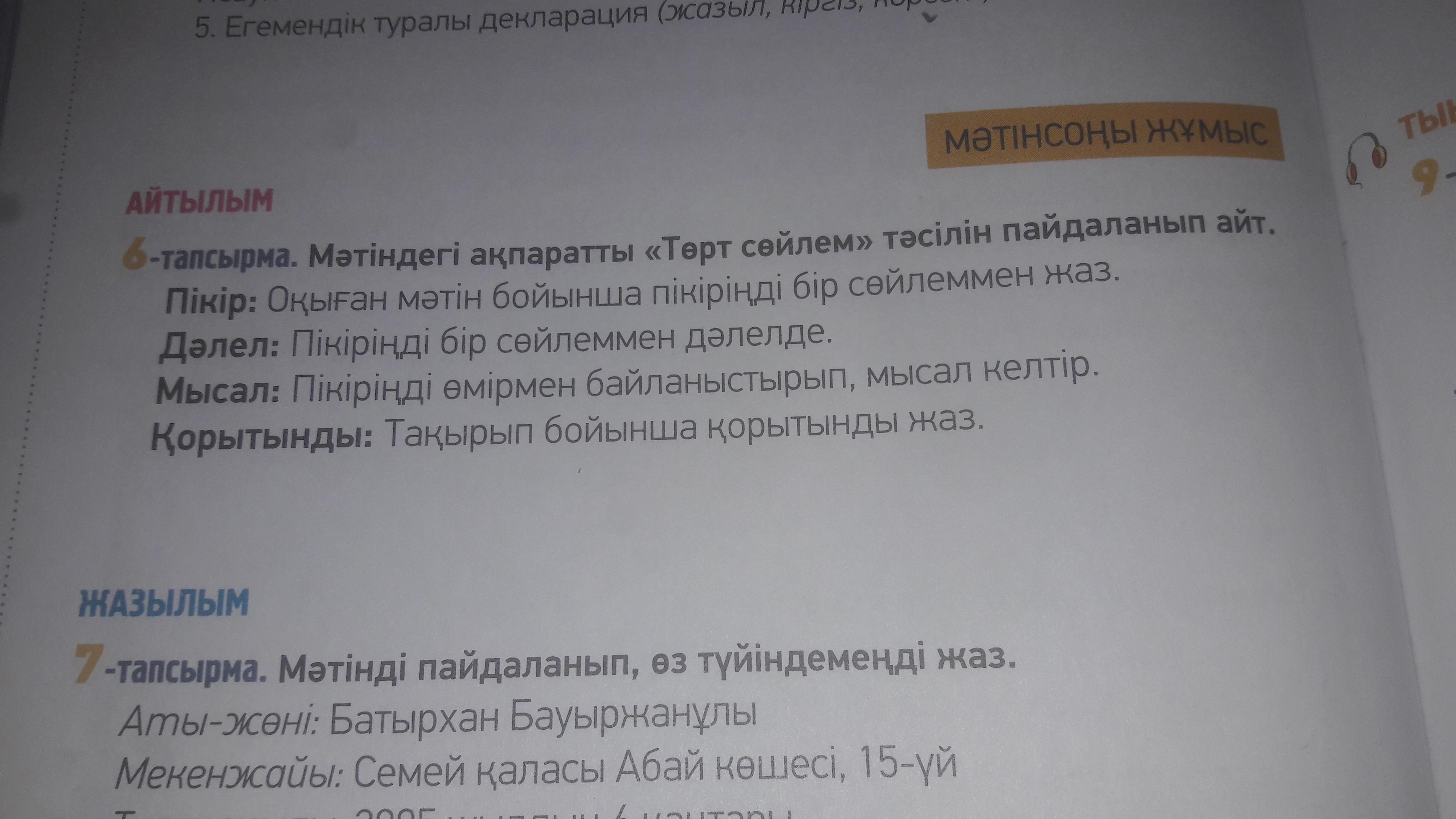 Мəңгілік ел.Мəтіндегі ақпаратты "Төрт сөйлем" тəсілін пайдаланып айт. 6 тапсырма