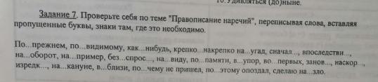По-прежнему, по-видимому, как нибудь, крепко-накрепко, наугад, сначала, впоследствии, наоборот, например, без спроса, на виду, по памяти, в упор, вопервых, на скоро, изредка, накануне, вблизи, почему не пришёл, поэтому опоздал, сделаю назло