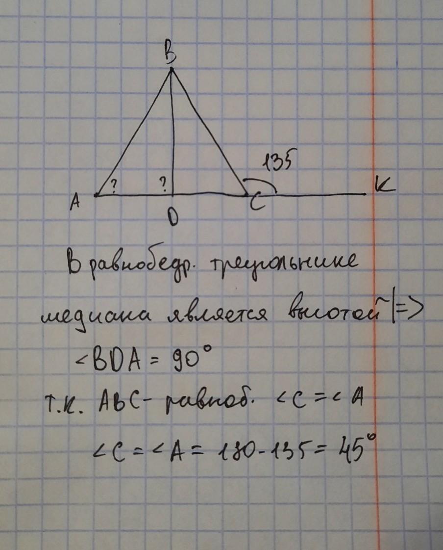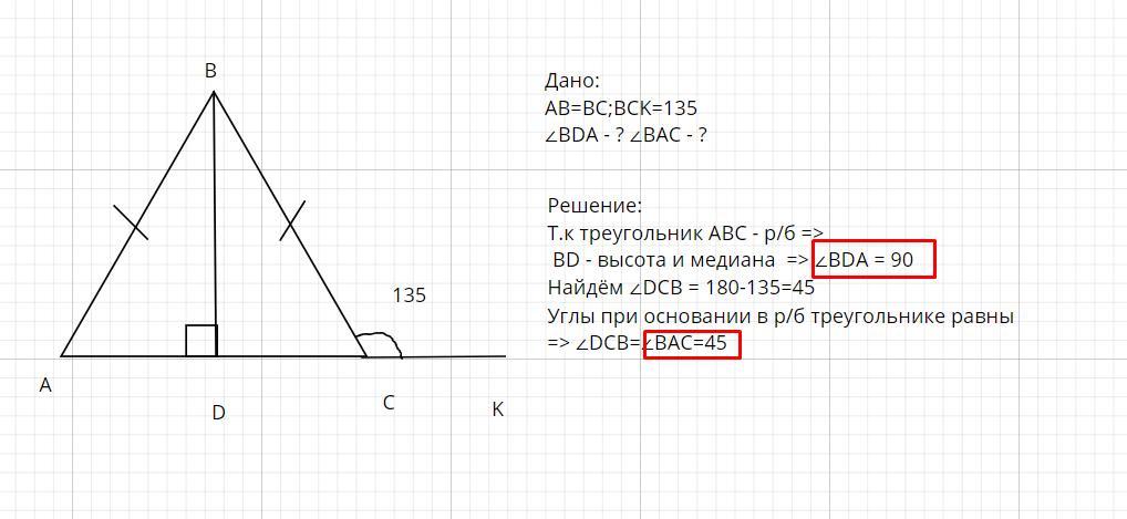 В равнобедренном треугольнике АВС с основанием АС проведена медиана BD. Найдите градусные меры углов ВDА и BАC, если внешний угол ВСК равен 135⁰