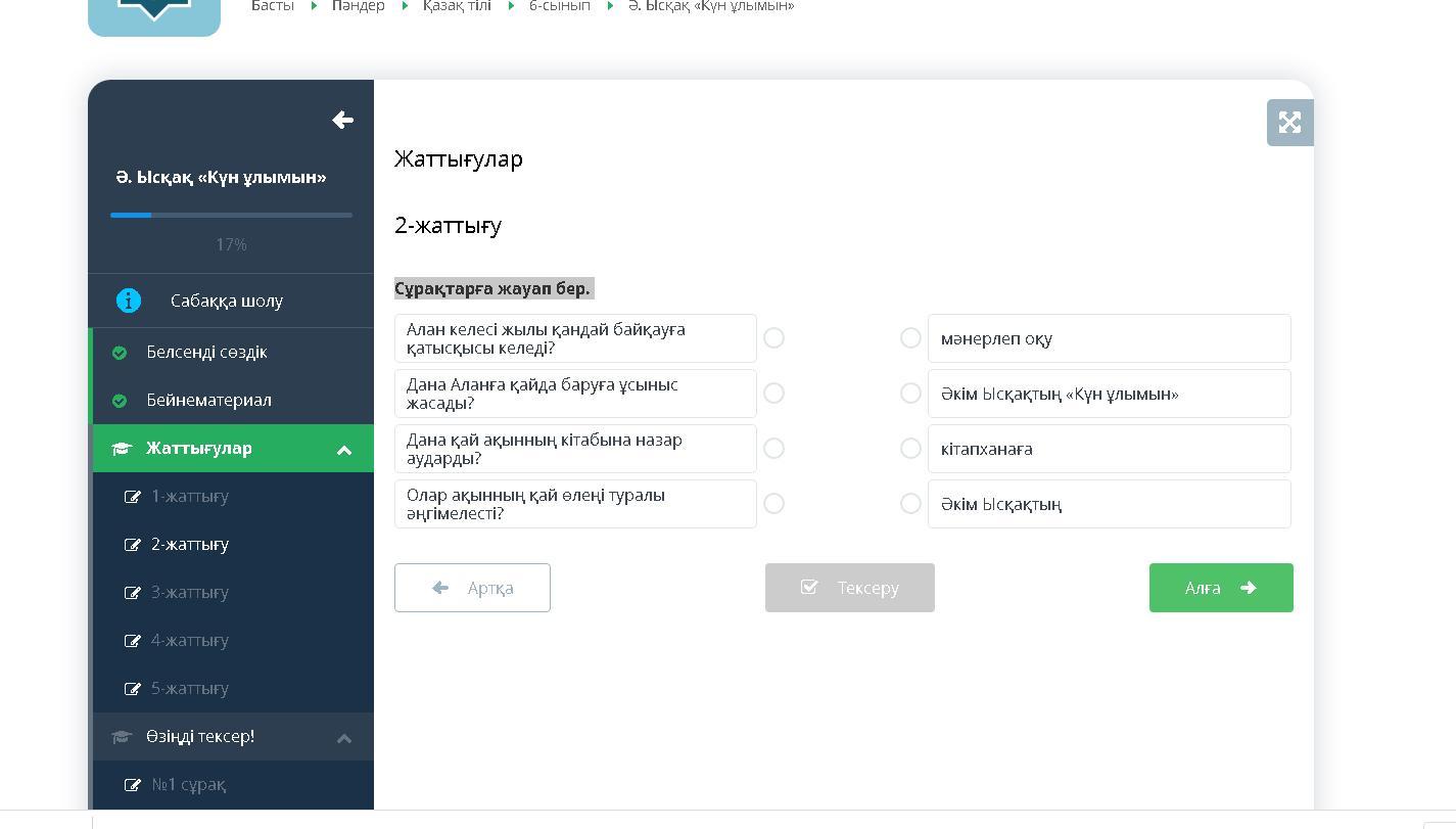Сұрақтарға жауап бер. Алан келесі жылы қандай байқауға қатысқысы келеді? Дана Аланға қайда баруға ұсыныс жасады? Дана қай ақынның кітабына назар аударды? Олар ақынның қай өлеңі туралы әңгімелесті? мәнерлеп оқу Әкім Ысқақтың «Күн ұлымын» кітапханаға Әкім Ысқақтың Артқа Тексеру Алға