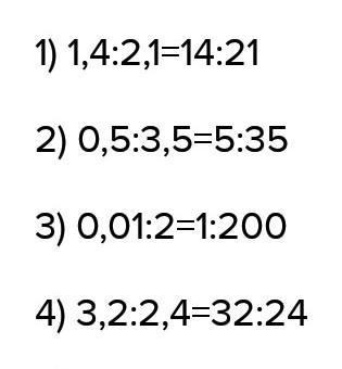 1 задание. 1) 1,4 : 2,1; 2) 0,5 : 3,5; 3) 0,01 : 2; 4) 3,2 : 2,4