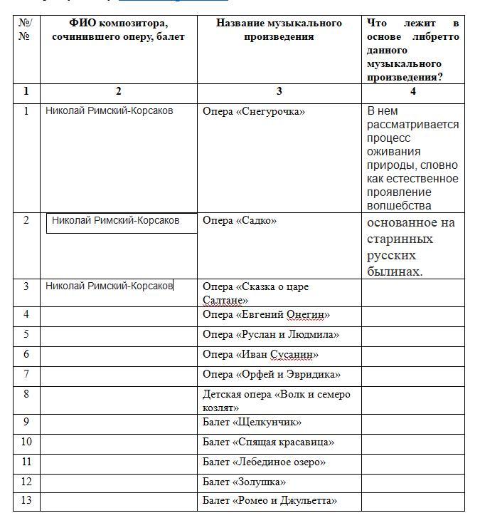 Здравствуйте! Чайковский, Глинка, Глинка, Глюк, Прокофьев, Чайковский, Чайковский, Чайковский, Прокофьев, Прокофьев. На Высшем бы месте я бы не стала так подробно писать про либретто. Почти везде это сказка, которую перенесли в музыку.