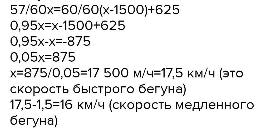 Два бегуна одновременно стартовали в одном направлении из одного и того же места круговой трассы в беге на несколько кругов. Спустя один час, когда одному из них оставалось 625 м до окончания первого круга, ему сообщили, что второй бегун прошёл первый круг 3 минуты назад. Найдите скорость первого бегуна, если известно, что она на 1,5 км/ч меньше скорости второго.