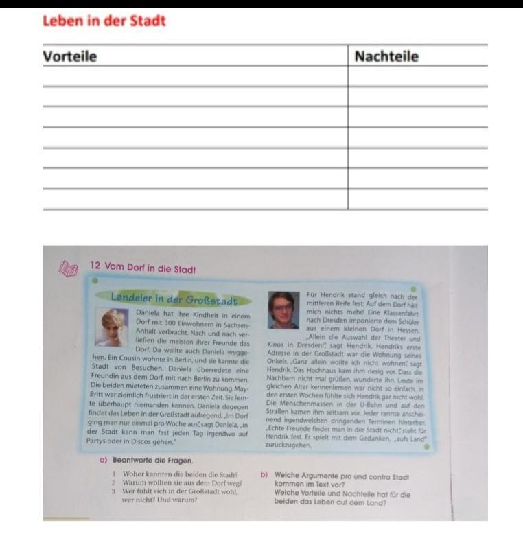 2. Daniela wollte aus dem Dorf weg, weil nach und nach die meisten ihrer Freunde das Dorf verlassen haben und man kein breites Angebot der Freizeitgestaltung hatte. Man konnte im Dorf nur einmal pro Woche ausgehen. In der Stadt gibt es dagegen viele Möglichkeiten, freie Zeit interessant zu gestalten. Hendrik wollte Theater und Kinos besuchen.