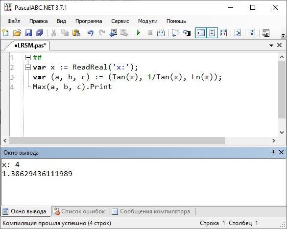 Найти max значение из трёх велечин ,апределяемых арифметическими выражениями а=tg(x) ,b=ctg(x),c=ln(x) при заданых значениях х