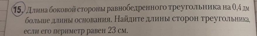 Длина боковой стороны равнобедренного треугольника на 0,4 дм больше длины основания. Найдите длины сторон треугольника, если его периметр равен 23 см.