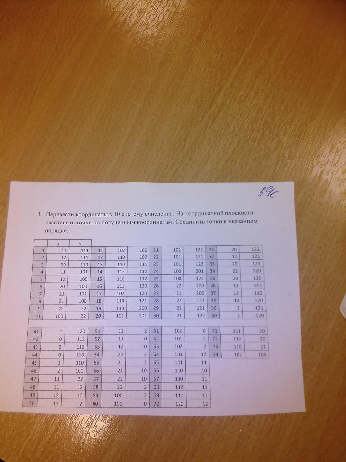 Во-вторых, надо начертить рисунок на координатной плоскости. У стандартной координатной плоскости есть "две линии": линия X и Y (смотри первое фото). Теперь посмотрим, какие максимальные числа в рядах X и Y. У X максимальное 120 (в троичной) = 15 десятичной, у Y 201 = 19. Соответсвенно, наша координатная плоскость будет на 15 клеточек в длину и на 19 в высоту. Отсчет начинается от одной общей точки (от 0). Ну и далее просто ставишь точки по координатам (в десятичной системе) и потом соединяешь. Допустим, у первой точки координаты 4 и 13. Значит отступаем от нуля до 4 по X, и от нуля до 13 по Y. На стыке X и Y ставим точку. Ниже представил пример с 3 первыми точками (не обращай внимания на то, что Y не 19 в высоту, а меньше, у тебя должно быть все правильно).