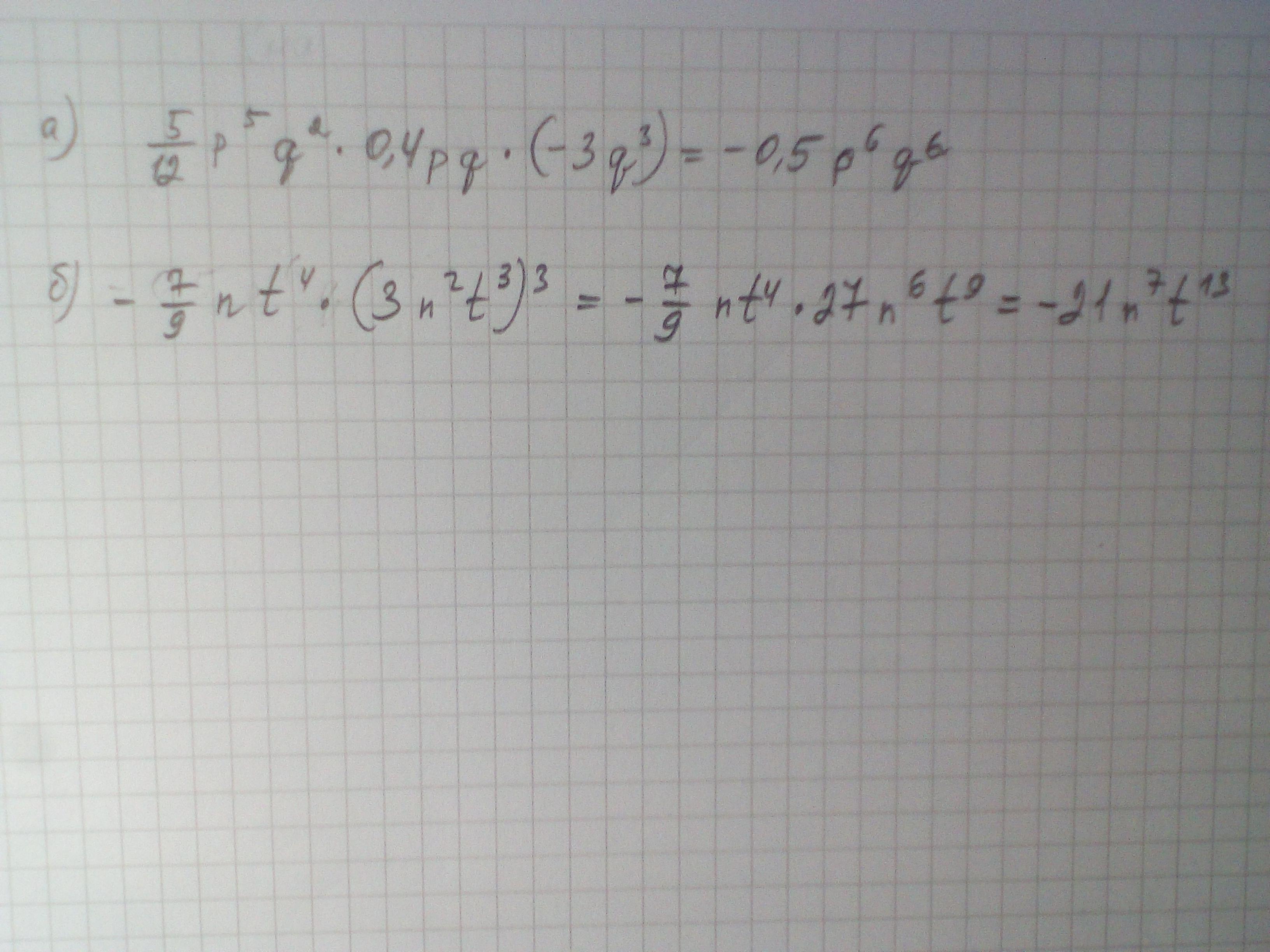 б) сначала возведите в степень выражение в скобках; при возведении степени в степень показатели степеней перемножаются; потом перемножьте коэффициенты и буквенные выражения