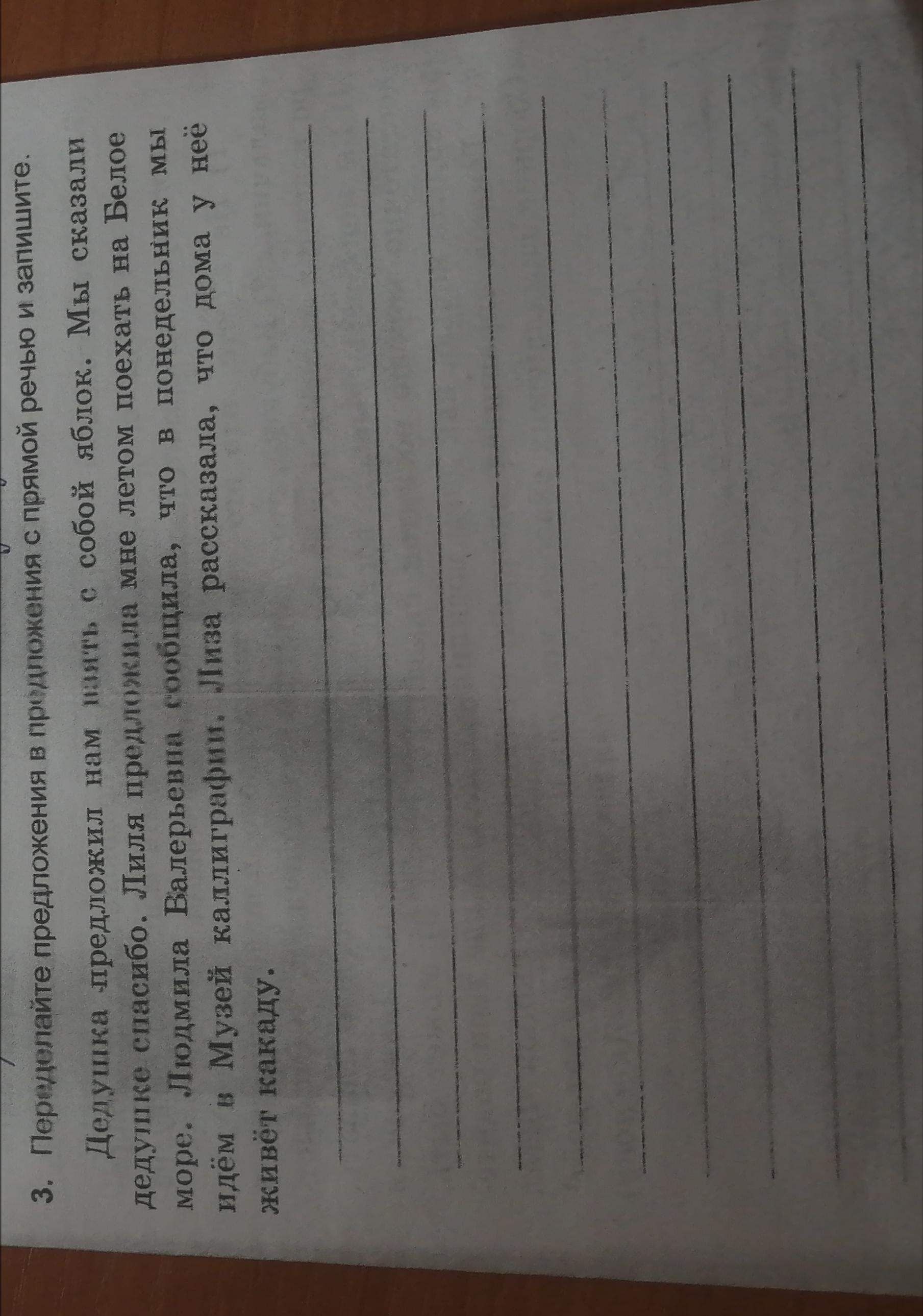 "Возьмите яблоки с собой,"-предложил нам дедушка. Мы сказали дедушке:"Спасибо". "Поехали на белое море?"-предложила мне Лиля. "В понедельник мы идём в Музей каллиграфии,"-сообщила Людмила Валерьевна. "У меня дома живёт какаду,"-рассказала Лиза