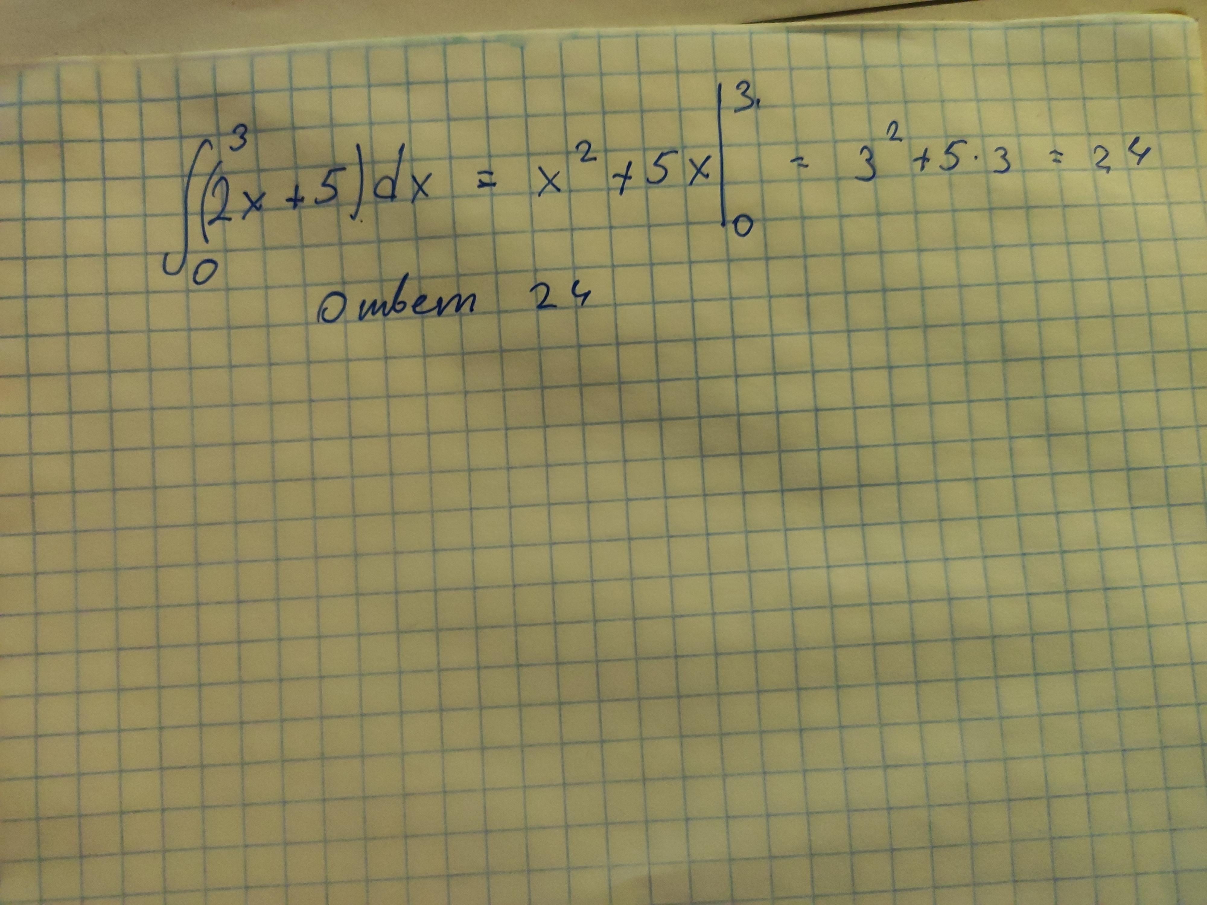 Определить площадь фигуры , образованной функцией у=2х+5 и осью при изменении х от 0 до 3. (При помощи интеграла)