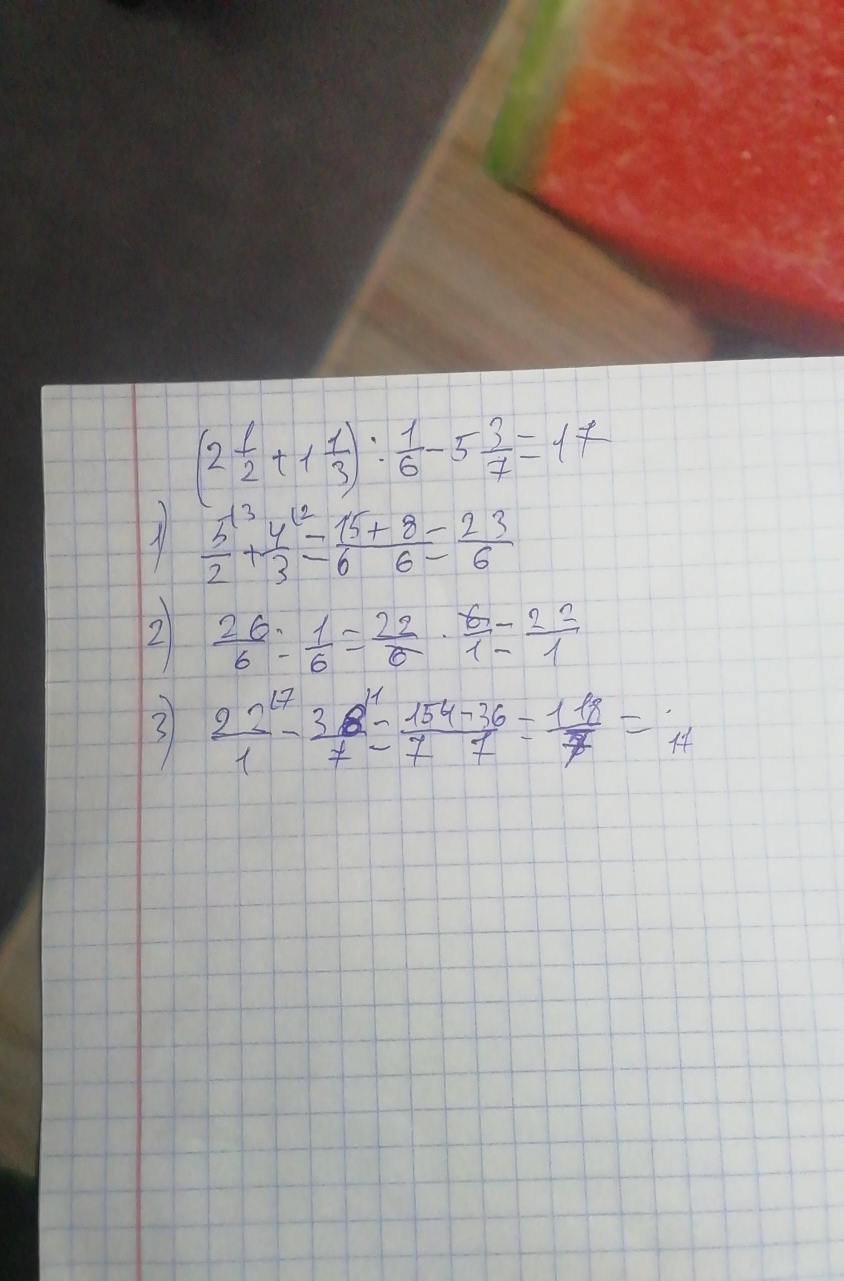 1) 5/2+4/3=23/6 ......2)26/6:1/6=22.......3)22/1-38/7=17. ОТВЕТ 17