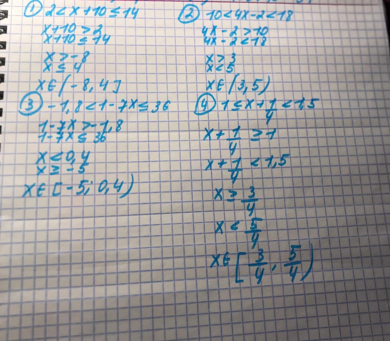Решите неравенство: 1) 2 <х+ 10 ≤ 14; 2) 10<4х-2< 18; 3) -1,8 < 1 - 7х≤ 36; 4) 1 ≤x+1/4<1.5.