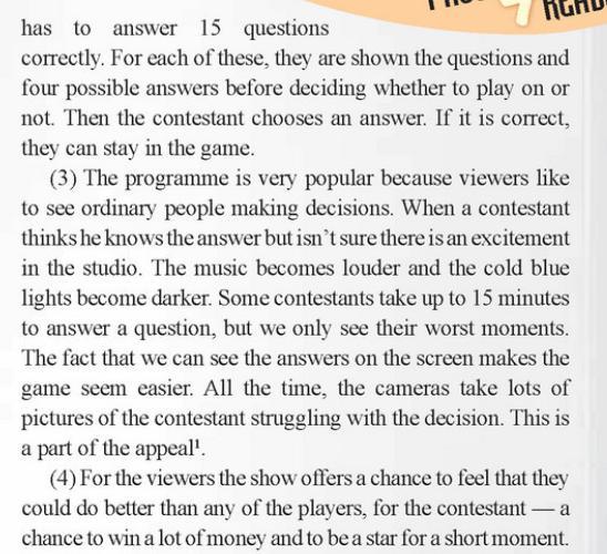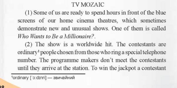 многие готовы часами сидеть перед экраном телевизора. И иногда там демонстрируют новые и необычные шоу. Одно из них " Кто хочет стать миллионером". В тексте описывается сам процесс телешоу и как участники стремятся выиграть много денег и получить минуты славы. Сама программа очень популярна, потому что зрителям нравится наблюдать, как игроки принимают непростые решения. Для зрителей шоу-это шанс почувствовать, что они способны на большее чем игроки.