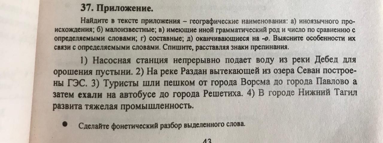 1) Насосная станция непрерывно подаёт воду из реки Дебед(приложение) для орошения пустыни. 2) На реке Раздан(приложение), вытекающей из озера Севан(приложение), построены ГЭС. 3) Туристы шли пешком из города Ворсма(приложение) до города Павлово(приложение), а затем ехали на автобусе до города Решетиха(приложение). 4) В городе Нижний Тагил(приложение) развита тяжёлая промышленность.