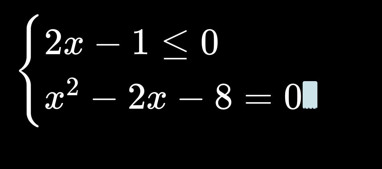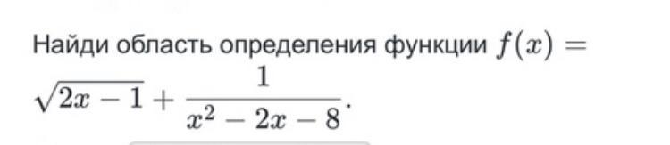 корень из отрицательного числа вычислить нельзя, соотвественно составляешь неравенство 2x - 1 <=0; на нуль делить нельзя, соотвественно приравниваешь x^2-2x-8 к нулю, и получаешь систему, и ответ: -2