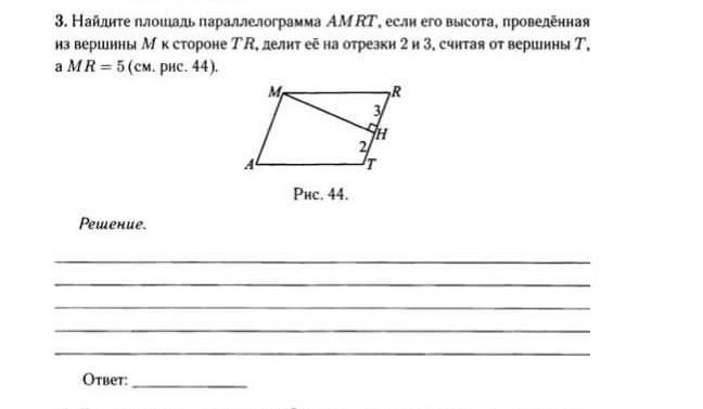 Сторону ТR мы найдем как сумму ТК и КR (ТR= 2+3=5 cм), а высоту МК по теореме Пифагора (из ΔМКR: RM= 5 см, KR=3 см, значит, МК=√(5²-3²)=4 см). остается умножить 5*4=20 см²