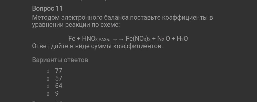 Fe + 4HNO3 → Fe(NO3)3 + NO + 2H2O , 1+4+1+1+2=9, четвёртый ответ