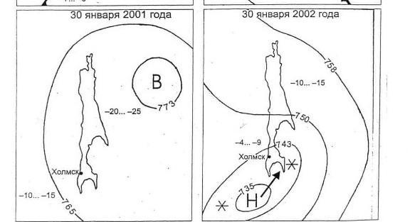 30 января 2001 года стояла холодная погода (-20,-25) и на побережье до -15, выраженная антициклоном над островом. 30 января 2002 года стояла пасмурная, с лёгким морозцем до -15, выраженная циклоном. На юге острова возможны снегопады.