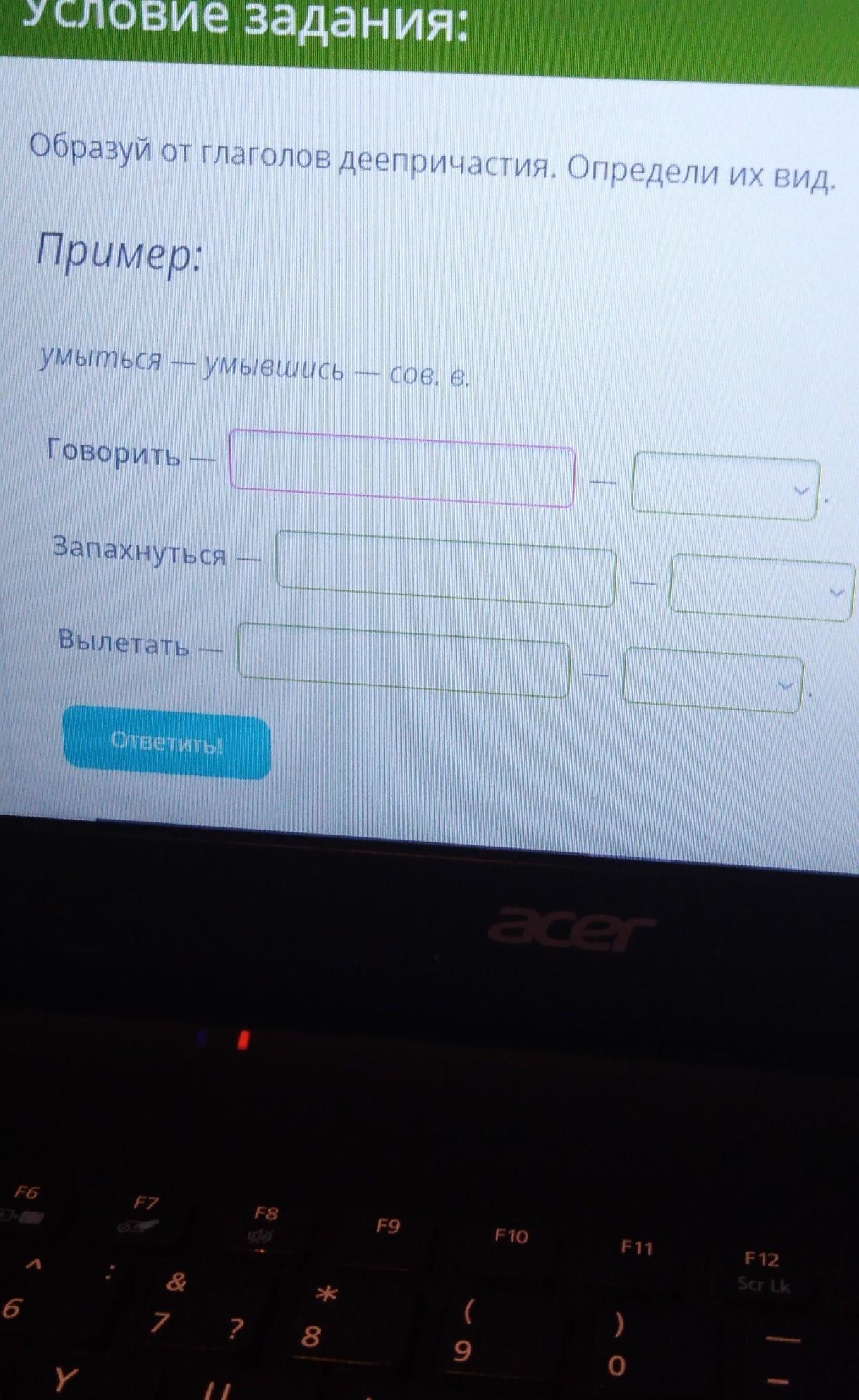 Говоря (несов.вид), запахнувшись (совер.вид), вылетая (несов.вид)