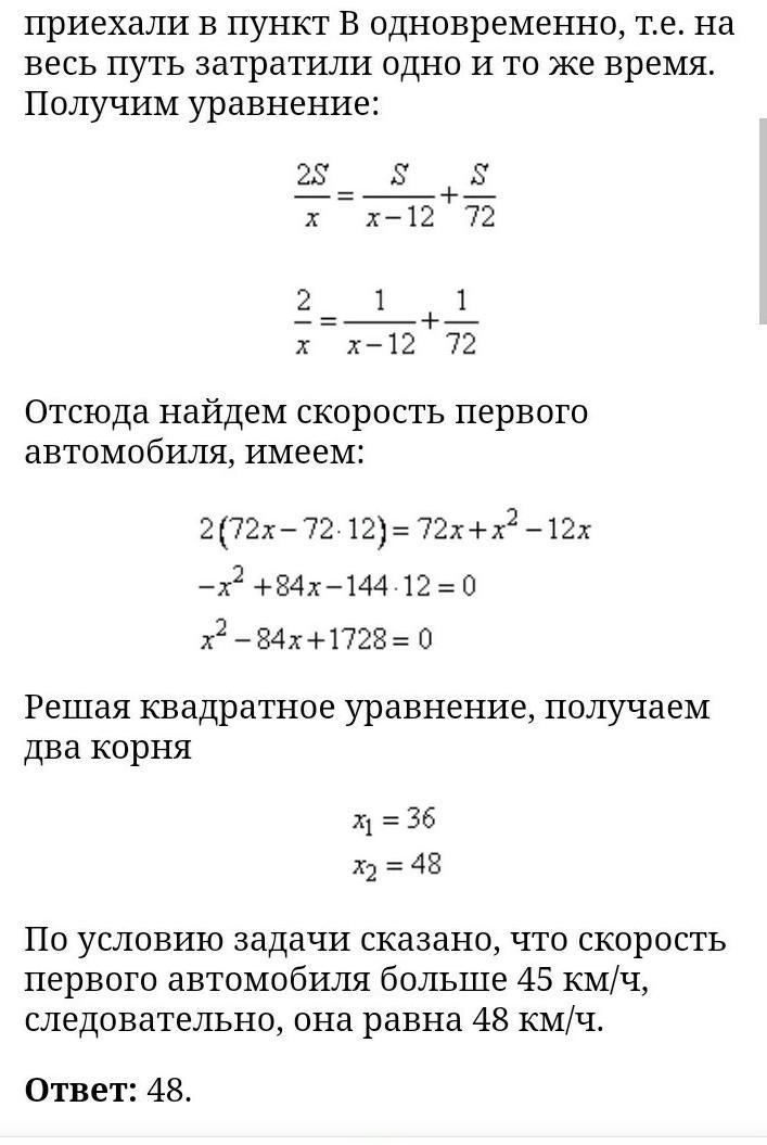 Из пункта а в пункт б одновременно выехали два автомобиля. первый проехал с постоянной скоростью весь путь. второй проехал половину пути со скоростью, меньшей скорости первого автомобилиста на 12 км/ч, а вторую половину пути проехал со скоростью 72 км/ч, в результате чего прибыл в b одновременно с первым атомобилистом. Найдите скорость первого автомобилиста, если известно, что она больше 45 км: ч ответ дайте в км,ч