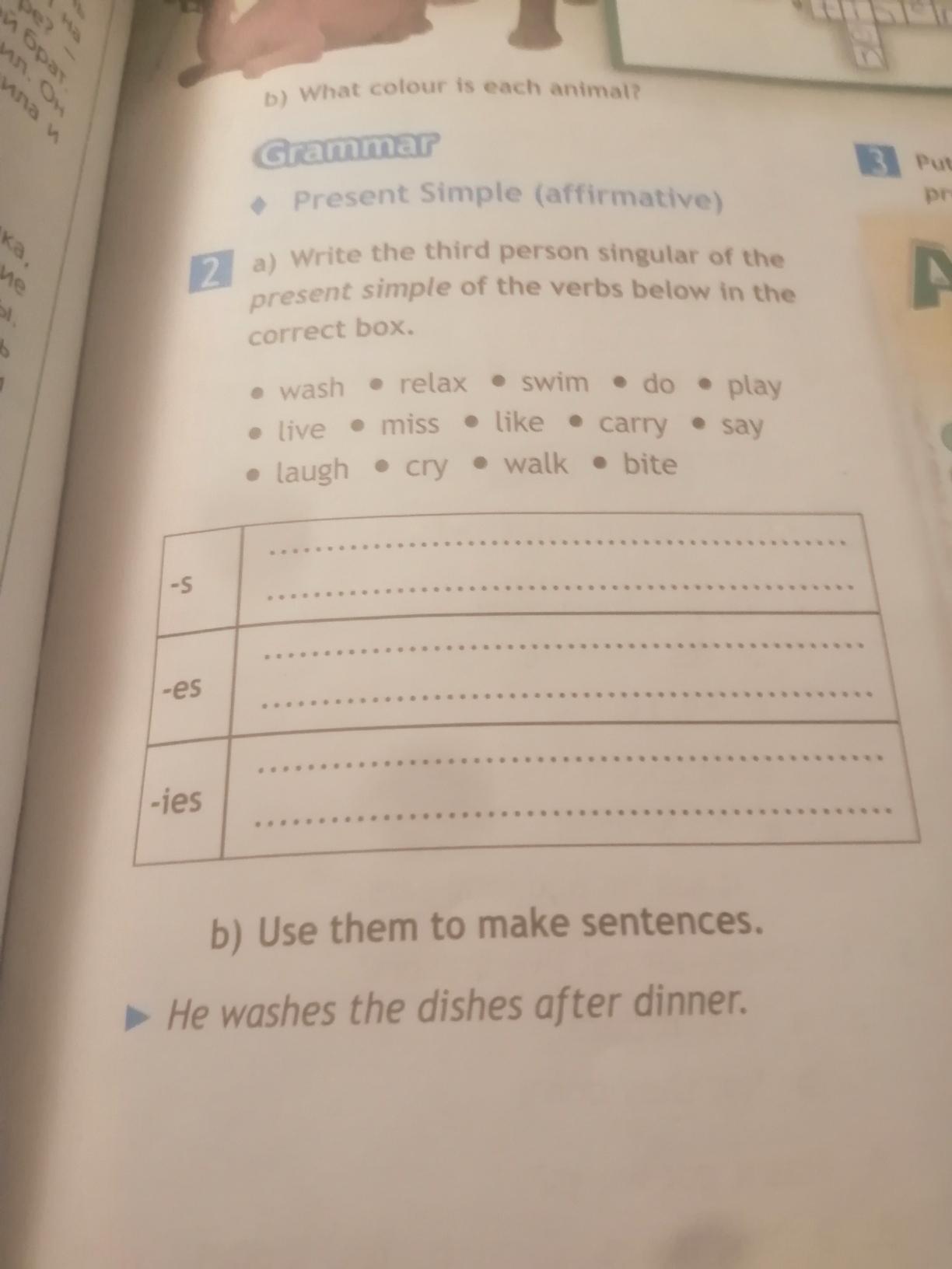 washes, relaxes, swims, does, plays, lives, misses, likes, carries, says, laughs, cries, walks, bites