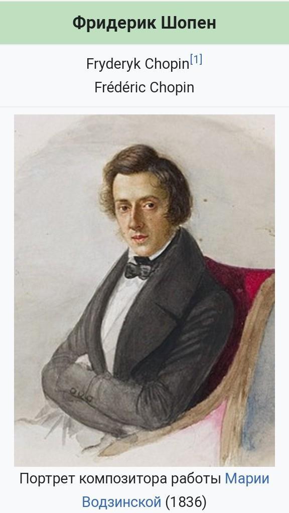Фридери́к Шопе́н[2][3], полное имя — Фридерик Францишек Шопен (польск. Fryderyk Franciszek Chopin, также Szopen)[4]; полное имя во французской транскрипции — Фредери́к Франсуа́ Шопе́н (фр. Frédéric François Chopin)[5] (1 марта[6][7] (по другим данным, 22 февраля[8]) 1810, деревня Желязова-Воля, близ Варшавы, Варшавское герцогство — 17 октября 1849, Париж, Франция) — польский композитор и пианист французско-польского происхождения. В зрелые годы (с 1831 года) жил и работал во Франции. Один из ведущих представителей западноевропейского музыкального романтизма, основоположник польской национальной композиторской школы. Оказал значительное влияние на мировую музыку.