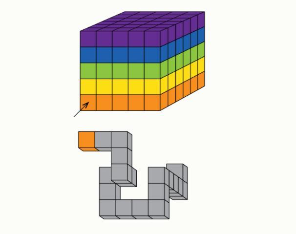 У Тани есть параллелепипед из кубиков, окрашенный по слоям. Таня вырезала из этого параллелепипеда змейку, у которой оранжевая только “голова” (в указанной оранжевой клетке). Сколько клеток каждого цвета в “змейке”?